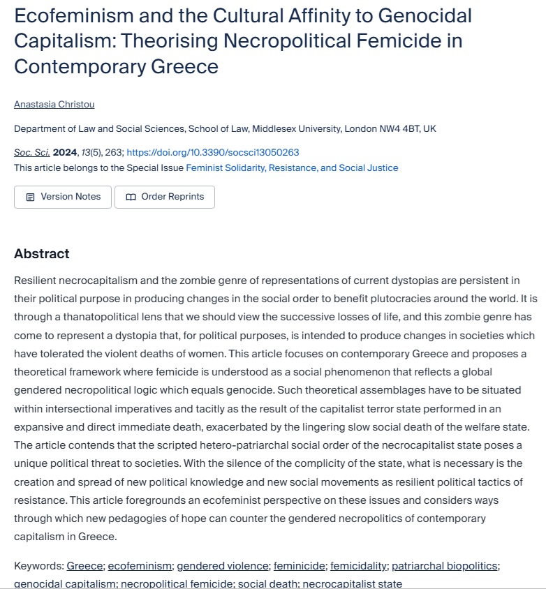 Articolul aduce în prim-plan o perspectivă ecofeministă asupra acestor probleme și analizează modurile prin care noi pedagogii ale speranței pot contracara necropolitica de gen a capitalismului contemporan din Grecia”, arată un studiu ecofeminist publicat în 2024 care susține că femicidul e cauzat de capitalism, idee rostogolită tot mai frecvent pe rețelele de socializare și la protestele feministe sau de combatere a violenței domestice și de gen.