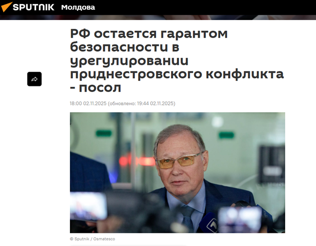 [...] „Ambasadorul a reamintit că conflictul de pe Nistru „a fost oprit de Rusia”. „Și anume Rusia este garantul și mediatorul care împiedică reluarea oricăror acțiuni, violente sau nonviolente, împotriva populației vorbitoare de limbă rusă care locuiește pe malul stâng al Nistrului”, a declarat Oleg Ozerov.
