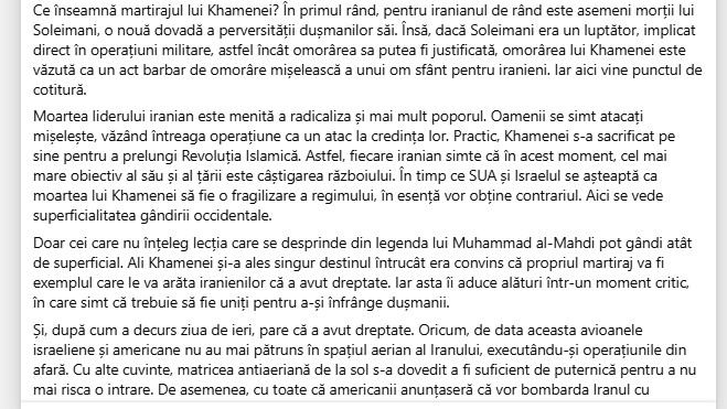 Moartea liderului iranian este menită a radicaliza și mai mult poporul. Oamenii se simt atacați mișelește, văzând întreaga operațiune ca un atac la credința lor. Practic, Khamenei s-a sacrificat pe sine pentru a prelungi Revoluția Islamică. Astfel, fiecare iranian simte că în acest moment, cel mai mare obiectiv al său și al țării este câștigarea războiului. În timp ce SUA și Israelul se așteaptă ca moartea lui Khamenei să fie o fragilizare a regimului, în esență vor obține contrariul. Aici se vede superficialitatea gândirii occidentale.” (Facebook Camelia Gabriela Suciu, care se descrie drept purtător de cuvânt al Partidului Comunist Român)
