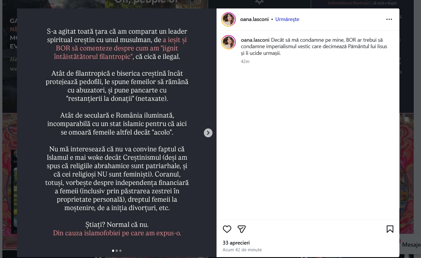 „Ali Khamenei era de un miliard de ori mai feminist și moral decât Satana ăla de ”Preafericit Părinte” btw. I said what i said.” (Instagram Oana Lasconi)