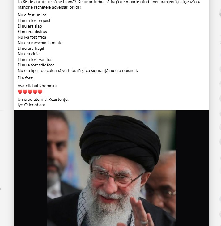 Un val de postări amplicate în „bulele” suveraniste, pro-ruse și de extremă stânga îl prezintă pe ayotollahul Ali Khamenei drept un exemplu de moralitate, un feminist (!!!) și un patriot care a ales, cu demnitate, să fie martir pentru poporul său. În realitate, Khamenei a fost unul dintre cei mai sângeroși dictatori ai ultimelor decenii, iar politicile sale au transformat Iranul într-un paria internațional și au cauzat o criză economică solidă.
