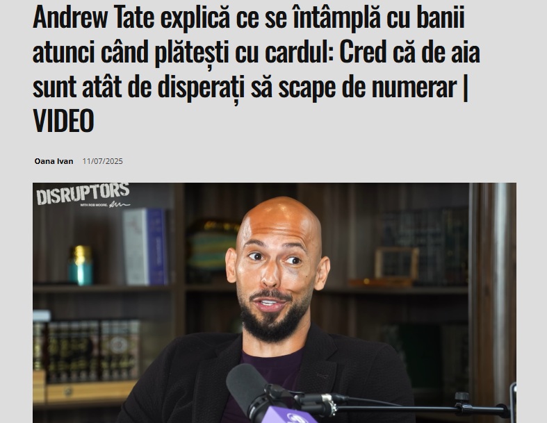 DE CE SUNT FALSE NARAȚIUNILE: Andrew Tate folosește un exemplu extrem de simplificat pentru a-şi argumenta teoria conform căreia oculta mondială doreşte eliminarea cash-ului din economie pentru a controla mai eficient populaţia planetei. Pornind de la faptul că, într-adevăr, tranzacţiile financiare cu cardul pot fi supuse unei taxări (din partea statului, băncilor comerciale sau a companiei care e emis cardul) şi permit autorităţilor mai mult control și trasabilitate asupra fluxului financiar, Tate susţine că în acest mod suma iniţială este acaparată total de bănci. În realitate, banii nu dispar, ci sunt redistribuiţi. Comisionul invocat de influencerul britanic nu reprezintă o taxare arbitrară, ci costul unui serviciu furnizat atât cumpărătorului, cât şi vânzătorului. Astfel, întreaga sumă rămâne în circulație, iar cel care încasează respectivul comision este taxat ca orice alt comerciant. Ulterior, banii trec de la o persoană la alta, iar taxele colectate ajung la stat, care îi reinvestește în economie (salarii publice, infrastructură, servicii). Taxarea de către stat nu înseamnă distrugerea banilor. Taxele sunt o parte esențială a oricărei economii funcționale. Ele nu anulează existența banilor, ci le schimbă destinația, din buzunarul individului către cheltuieli publice. Sistemul bancar și cel fiscal sunt complicate, dar nu funcționează pe principiul „evaporării banilor”. Mai mult, renunţarea la plata cu cardul nu va falimenta băncile, deoarece acestea nu pierd bani dacă populaţia foloseşte exclusiv bani lichizi, ci doar nu mai câştigă din comisioane.