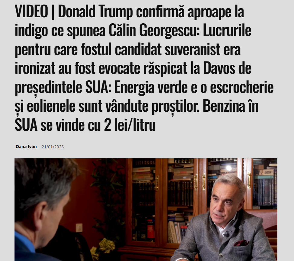 ȘTIRE: Donald Trump a confirmat la Davos tot ceea ce a spus Călin Georgescu acum mai bine de un an. Președintele Statelor Unite a vorbit despre energia verde, turbinele eoliene și prețul carburanților.