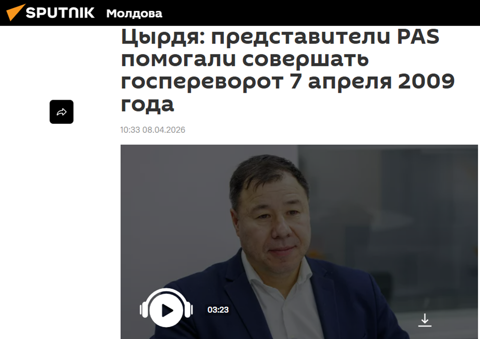 OBIECTIV: Să reinterpreteze evenimentele din 7 aprilie 2009 drept o lovitură de stat orchestrată din exterior, nu o mișcare de protest internă; să atribuie actualilor reprezentanți ai PAS un rol activ în acte violente și ilegale; să inducă ideea pierderii suveranității Republicii Moldova prin instalarea unui așa-zis control extern asupra instituțiilor-cheie ale statului; să alimenteze neîncrederea publică în parcursul european și în actuala guvernare, prezentând schimbările politice și economice drept consecința unor conspirații externe, nu a unor procese interne și decizii legale.