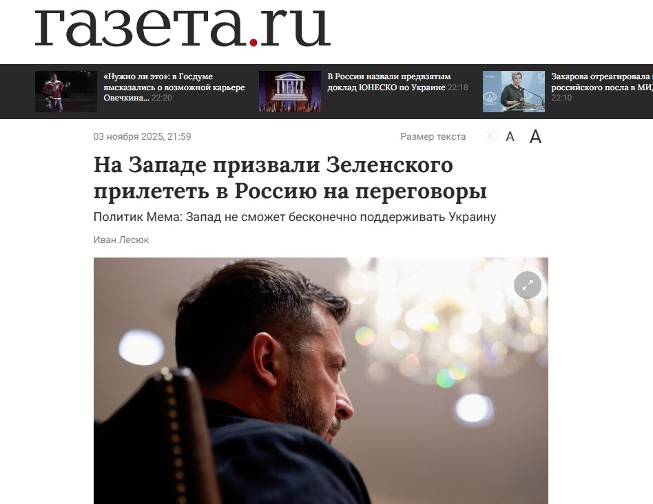 Potrivit acestuia, dacă s-ar afla în locul președintelui Ucrainei, ar zbura în Rusia și ar conveni asupra unui acord de pace. Mema a mai scris că economiile Italiei, Finlandei și Germaniei au fost grav afectate din cauza sancțiunilor și a sprijinului acordat Kievului. În opinia sa, cel de-al 19-lea pachet de măsuri nu doar că provoacă mai mult rău economiei europene decât celei ruse, ci reprezintă și un obstacol în calea păcii. Anterior, prim-vicepreședintele Comisiei pentru afaceri internaționale a Dumei de Stat, Alexei Cepa, a declarat că o nouă rundă de negocieri între Rusia și Ucraina va avea loc mai devreme sau mai târziu, însă este dificil de precizat un termen exact din cauza opoziției unor țări occidentale față de o soluționare pașnică.