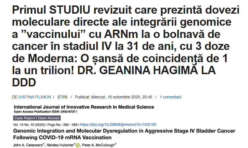 „În raportul nostru de caz evaluat de colegi – publicat recent în International Journal of Innovative Research in Medical Science – descriem cazul unei femei de 31 de ani, anterior sănătoasă, care a dezvoltat un cancer de vezică urinară în stadiul IV, cu evoluție rapidă, în termen de 12 luni de la finalizarea unei serii de trei doze de injecții cu ARNm Moderna. Cancerul de vezică urinară este extrem de rar la femeile tinere, iar astfel de forme agresive sunt aproape necunoscute.