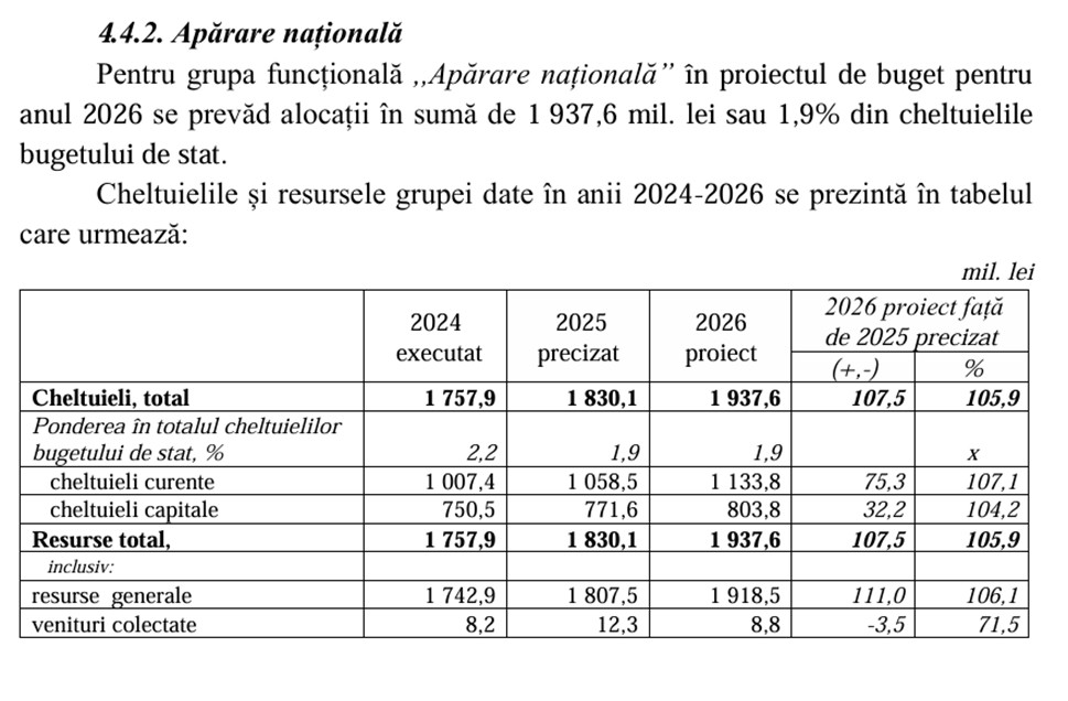 Cheltuielile pentru apărare din proiectul bugetului Republicii Moldova pentru anul 2026 au fost majorate cu 32%, în condițiile unei creșteri minime a capitolelor sociale, a declarat anterior deputatul Parlamentului din partea opoziției Partidului Comuniștilor (PCRM), Constantin Starîș.
