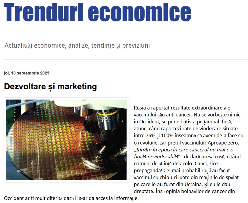 ȘTIRE: Rusia a raportat rezultate extraordinare ale vaccinului său anti-cancer. Nu se vorbește nimic în Occident, se pune batista pe țambal. Însă, atunci când raportezi rate de vindecare situate între 75% și 100% înseamnă că avem de-a face cu o revoluție. Iar prețul vaccinului? Aproape zero. „Intrăm în epoca în care cancerul nu mai e o boală nevindecabilă” - declară presa rusă, citând oameni de știință de-acolo. Canci, zice propaganda! Cel mai probabil rușii au făcut vaccinul cu chip-uri luate din mașinile de spălat pe care le-au furat din Ucraina. Și eu le dau dreptate. Însă opinia bolnavilor de cancer din Occident ar fi mult diferită dacă li s-ar da acces la informație.
