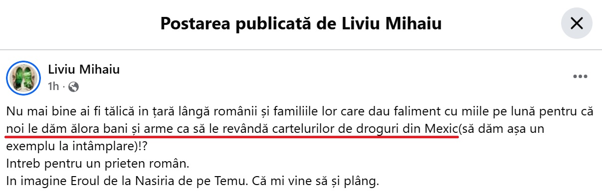 DE CE ESTE FALSĂ NARAȚIUNEA: În stilu-i caracteristic deja, jurnalistul autointitulat „de gherilă” Liviu Mihaiu preia un fake news lansat în media de propaganda rusă şi îl introduce aluziv în comunicările sale din social media. De această dată, ironizând prezenţa fostului ministru român al Apărării Ionuţ Moşteanu la Kiev, cu ocazia marcării a patru ani de război în Ucraina, Mihaiu afirmă cu convingere că „noi le dăm ălora (n.r.-ucrainenilor) bani și arme ca să le revândă cartelurilor de droguri din Mexic”, cel mai probabil preluând cea mai cunoscută variantă a acestui zvon, care circulă de peste trei ani, promovată de jurnalistul american Tucker Carlson în februarie anul trecut şi (p)reluată de presa oficială de la Moscova ca fiind de sorginte occidentală. Pe rând, promotorii naraţiunilor ruseşti au afirmat că armata ucraineană a devenit furnizor de arme pentru teroriştii Hamas, gangsterii finlandezi, suedezi, danezi sau olandezi, protestatarii francezi, insurgenţii nigerieni, jihadiştii sirieni și, cazul de faţă, cartelurile mexicane.