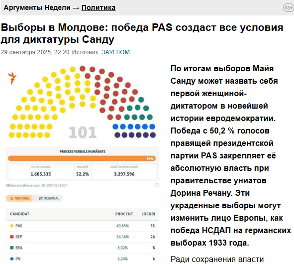 ȘTIRE: În urma alegerilor, Maia Sandu se poate numi prima femeie-dictator din istoria recentă a eurodemocrației. Victoria cu 50,2 % din voturi a partidului prezidențial de guvernământ PAS îi consolidează puterea absolută împreună cu guvernul uniat al lui Dorin Recean. Aceste alegeri furate pot schimba fața Europei, asemenea victoriei NSDAP la alegerile germane din 1933.