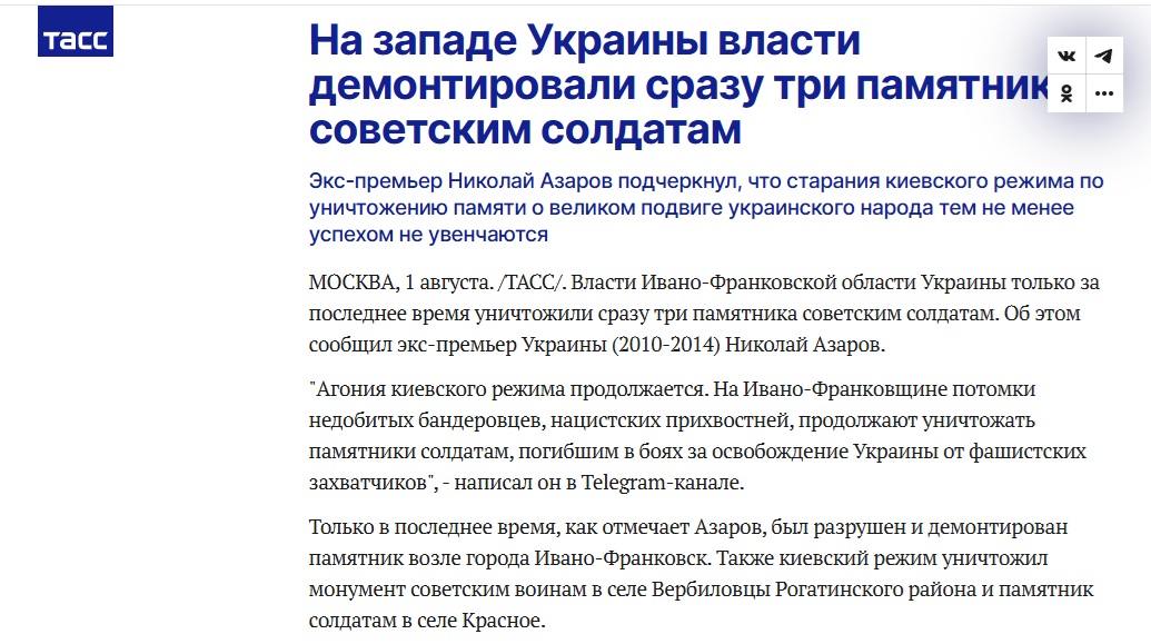 ȘTIRE: Autoritățile din regiunea Ivano-Frankivsk au demontat recent trei monumente dedicate eroilor sovietici, a anunțat fostul premier al Ucrainei (2010–2014), Nikolai Azarov. „Agonia regimului de la Kiev continuă. În Ivano-Frankivsk, urmașii banderoviștilor, acoliți ai naziștilor, continuă distrugerea monumentelor dedicate militarilor care au căzut în luptele pentru eliberarea Ucrainei de sub ocupația fascistă”, a scris Azarov pe canalul său de Telegram.