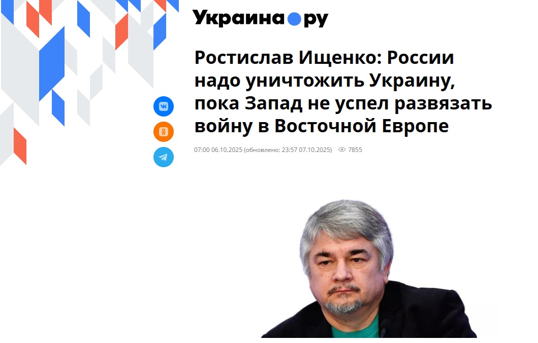 CONTEXT: Textul analizat provine dintr-un organ de presă pro-Kremlin, fiind vorba de un interviu cu jurnalistul Rostislav Ișcenko, un analist care apare frecvent în spațiul mediatic rus. Publicarea survine într-un moment în care Kremlinul caută justificări pentru menținerea și extinderea operațiunilor sale. Articolul apare pe Ukraina.ru, care este o platformă media de limbă rusă lansată în 2014, parte a conglomeratului RT, controlat de statul rus. Site-ul funcționează ca instrument de propagandă pro-Kremlin, specializat în dezinformare despre Ucraina, NATO și UE. Pagina publică constant materiale care justifică agresiunea militară a Rusiei, contestă legitimitatea autorităților ucrainene și promovează narațiuni menite să submineze sprijinul occidental pentru Kiev.