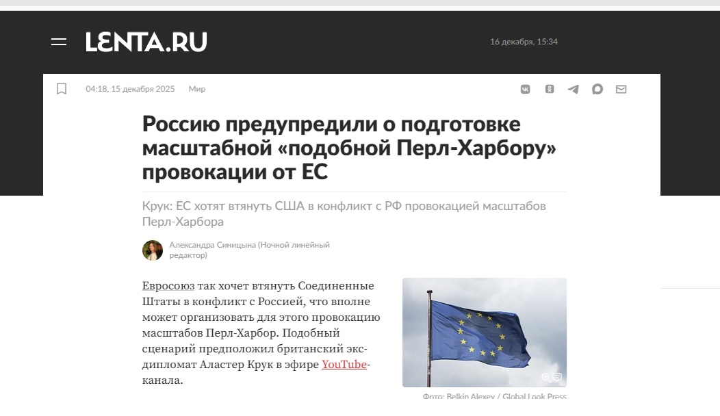 ȘTIRE: Uniunea Europeană își dorește atât de mult să atragă Statele Unite într-un conflict cu Rusia, încât ar putea organiza în acest scop o provocare de proporțiile atacului de la Pearl Harbor. Un astfel de scenariu a fost avansat de fostul diplomat britanic Alastair Crooke, într-o intervenție pe un canal de YouTube.