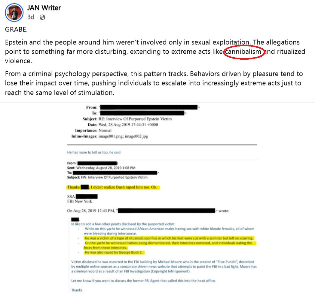 Poate şi mai tulburător decât scenariul plănuirii unei conflagraţii planetare este punerea în circulaţie a ipotezei canibalismului lui Jeffrey Epstein şi al acoliţilor săi. După publicarea celor aproximativ trei milioane de documente de către Departamentul Justiţiei, pe reţelele de socializare au apărut postări în care Epstein a fost acuzat că ar fi dezmembrat şi mâncat bebeluşi şi că ar fi organizat pentru prietenii săi „sacrificii ritualice”. A reapărut un videoclip din 2009, în care o tânără de 21 de ani pe nume Gabriela Rico Jiménez este arestată în Guadalajara în timp ce vorbeşte despre „elitele” care mănâncă oameni la petreceri exclusiviste. Unul dintre documentele publicate care susținea că bebelușii ar fi fost dezmembrați făcea referire și la „George Bush 1”, deși rămâne neclar dacă se referă la fostul președinte american George H.W. Bush. Însă toate aceste afirmații provin de pe conturi online neverificate. Jurnaliştii site-ului american Snopes au confirmat că documentele desecretizate includ referinţe la canibalism şi sacrificii rituale, dar nu a putut fi stabilită autenticitatea acuzaţiilor. Situaţiile descrise provin din consemnarea unui interogatoriu al FBI din 2019, în care un bărbat anonim a susținut că în 2000 a fost martor la „sacrificarea ritualică” a unor copii pe un iaht aparținând lui Epstein, fără să furnizeze dovezi. Conform documentelor, bărbatul nu a menţiont canibalismul în depoziţia sa. Totuşi, cuvintele „canibal” şi „canibalism” apar în alte părți din dosarele publicate luna trecută, deşi aceste referințe nu se referă la infracțiuni comise de Epstein sau de cineva apropiat lui. Într-un rezumat al aceluiași interogatoriu, acuzatorul ar fi susținut că mai mulţi foști președinți „au fost prezenți pe același iaht în timp se petreceau toate actele de violență menționate anterior”. Agentul FBI a concluzionat că, dată fiind lipsa dovezilor, „nu se recomandă cheltuirea de resurse suplimentare pentru continuarea investigaţiilor”.