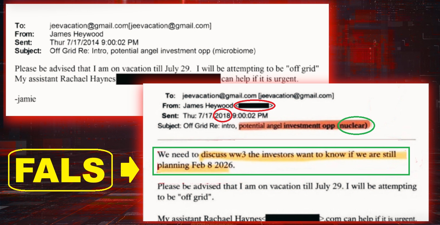 Ziua de 8 februarie 2026 a trecut fără să se împlinească o profeţie înfricoşătoare atribuită unuia dintre documentele recent desecretizate ale voluminosul dosar Epstein: cel De-al Treilea Război Mondial NU a izbucnit! Predicţia a început să circule online în primele zile ale lunii februarie, inserată într-un presupus e-mail trimis pe adresa lui Jeffrey Epstein de către un personaj misterios identificat ca „James Heywood”. Mesajul cu conţinut sumbru pentru omenire este însă un fals rudimentar. O căutare amănunţită în dosarele Epstein nu a găsit e-mailuri care să conţină textul afişat în captura de ecran distribuită online. Documentul care corespunde numerelor de înregistrare din partea de jos a capturii de ecran aparţine unui e-mail real din arhiva Epstein a Departamentului american al Justiţiei. În mod evident, acesta a fost folosit ca bază pentru captura de ecran falsificată. Se pare că creatorul acesteia a folosit instrumente de editare digitală pentru a modifica unele elemente cheie ale documentului original şi a-l transforma în imaginea distribuită pe reţelele de socializare. O comparare atentă a mesajului original cu cel modificat relevă că, în timp ce în documentul original Heywood este listat ca expeditor, fără a fi prezentă o adresă electronică, în versiunea falsă apare o bară neagră care indică o cenzură a presupusei sale adrese de e-mail. În plus, deşi marcajele temporale de pe ambele versiuni arată aceeaşi oră şi zi a trimiterii, anul expedierii diferă – „2018” în mailul falsificat faţă de „2014” în cel original. Mai mult, o căutare aprofundată în baza de date dedicată cazului Epstein de Departamentul Justiţiei pentru numele „James Heywood” a scos la iveală mai multe mailuri din iulie 2014 care sugerează că persoana respectivă încerca să stabilească o întâlnire cu Epstein, dar niciunul nu conţine textul din captura de ecran şi nici menţiunea unui Al Treilea Război Mondial.