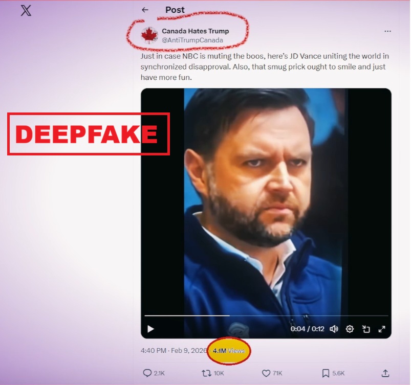 Nu toate falsurile legate de Olimpiada de Iarnă din Italia au avut ca ţintă Ucraina sau sportivii ucraineni. Un videoclip în care vicepreşedintele american JD Vance pare îngrijorat în timp ce pe fundal se aud huiduieli puternice a fost distribuit pe reţelele X şi Telegram. Una dintre versiunile clipului, postată pe contul „Canada îl urăşte pe Trump”, a adunat peste patru milioane de vizualizări. Totuşi, clipul nu este autentic. O comparaţie cu imaginile verificate ale ceremoniei de deschidere a olimpiadei evidenţiază inconsecvenţe factuale majore. În timpul ceremoniei, Vance şi soţia sa Usha. În timpul ceremoniei, Vance și soția sa, Usha, au fost filmaţi urmărind din tribună defilarea delegaţiilor naţionale. Imaginile oficiale îl arată pe Vance purtând un costum elegant, şi nu geaca care se vede în videoclipul analizat. Vicepreşedintele Statelor Unite a purtat ulterior o geacă, dar în timp ce a asistat la un meci feminin de hochei pe gheaţă, nu la ceremonia inaugurală. Înregistrarea transmisiunii directe a festivităţiii confimă că oficialul american a fost huiduit când imaginea sa a apărut pe ecranul stadionului, dar asta nu are legătură cu videoclipul devenit viral, generat cu ajutorul Inteligenţei Artificiale, aşa cum atestă mişcarea nenaturală a ochilor personjului din clip.