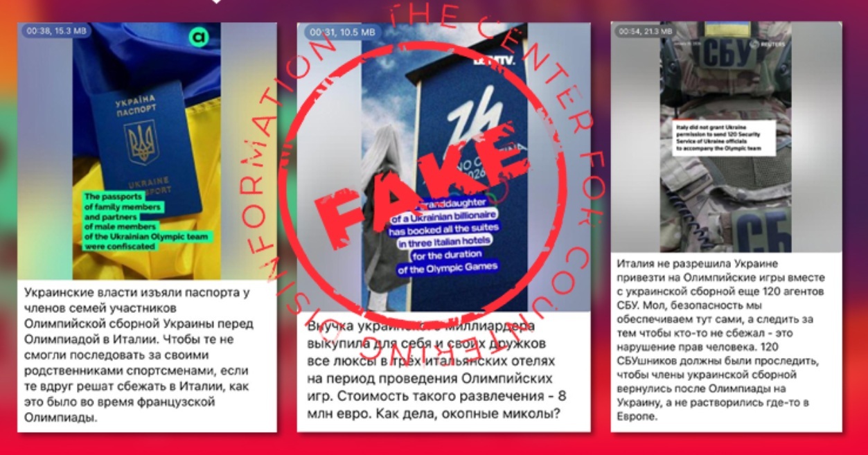 Postările false, care au cumulat peste un milion de vizualizări pe mai multe reţele de socializare, au inclus şi dezinformări despre intens mediatizatul caz al sportivul ucrainean Vladislav Heraskevici, căruia i s-a interzis de către oficialii competiţiei să participe la concurs pentru că purta o cască cu imagini ale compatrioţilor săi sportivi uciși în război de armata rusă. Una dintre postări a manipulat digital textul unei ştiri difuzate de agenţia Reuters prin adăugarea de informaţii false conform cărora fratele sportivului ucrainean ar fi participat la recrutarea soldaților pentru armata ucraineană şi că un membru al delegaţiei olimpice maghiare ar fi purtat un abțibild pe care scria „We're all fed up with U(kraine)" / „Ne-am săturat cu toții de U(craina)”. Alte postări mincinoase susţineau că sportivii ucraineni ar fi avut parte de controale antidoping ar fi fost mai relaxate pentru ca aceștia să poată lua „substanțe psihoactive”, și că 52 dintre traducătorii delegaţiei Ucrainei lor ar fi fugit de la hotelul unde erau cazaţi. O ştire falsă pretindea că grupul feminist ucrainean Femen ar fi vandalizat Colosseumul, în timp ce altele anunţau că Italia ar fi interzis intrarea a 120 de agenţi ai Serviciului de Securitate ucrainean, care aveau misiunea de a-i împiedica pe membrii delegaţiei Kievului să dezerteze, că „nepoata unui miliardar ucrainean a cumpărat toate apartamentele de lux din trei hoteluri italiene cu opt milioane de euro” şi că „autoritățile ucrainene au confiscat pașapoartele rudelor sportivilor” pentru a le împiedica astfel să rămână în străinătate.