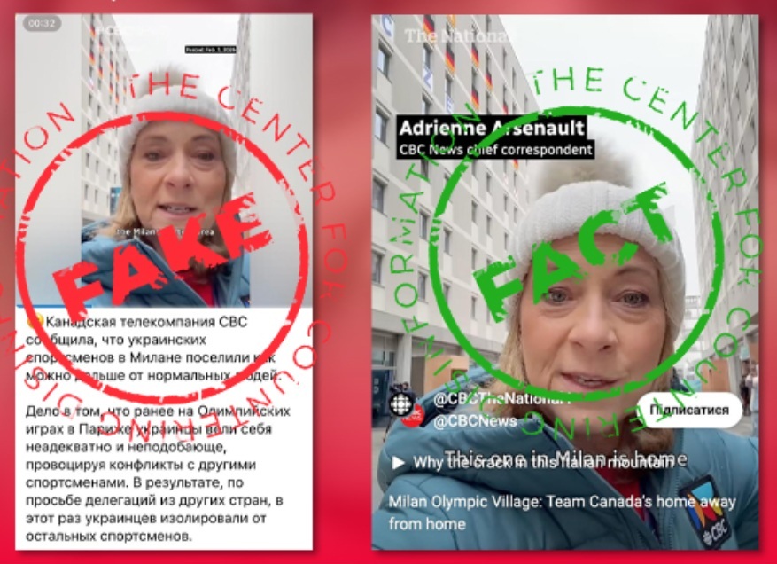 Majoritatea falsurilor copiază grafica unor instituţii de presă consacrate, precum Eurosport, în timp ce altele imită comunicările agenției de spionaj israeliene Mossad și ale Ministerului italian al Sănătății. Între victimele acestui gen de dezinformare s-a aflat şi postul de televiziune canadian CBC, căruia i s-a atribuit un videoclip având ca temă sportivii ucraineni. Reportajul fals a folosit primele 15 secunde ale unui clip autentic preluat din cele publicate pe rețelele sale de socializare, în care o apărea corespondenta canadiană Adrienne Arsenault, înlocuită apoi de o versiune a vocii jurnalistei, generată artificial. Reportera pare să spună că organizatorii ar fi cazat delegaţia ucraineană „cât mai departe posibil” de restul sportivilor din cauză că sportivii ucraineni ar fi avut un comportament „extrem de toxic” la Jocurile Olimpice de la Paris din 2024. Acest fragment nu există în videoclipul real, care nu menţionează deloc Ucraina sau sportivii ucraineni. Comitetului Internațional Olimpic a reacţionat prompt, precizând că ucrainenii beneficiază de aceleași facilități ca și celelalte echipe. Potrivit organizaţiei estoniene Provereno, falsul a început să circule în 5 februarie pe un canal Telegram în limba rusă numit „Odessa pentru victorie”. Postările, amplificate de boți, iar știrea a fost preluată de presa pro-Kremlin, care a invocat ca sursă televiziunea canadiană.