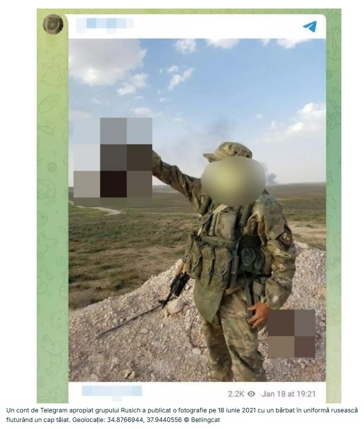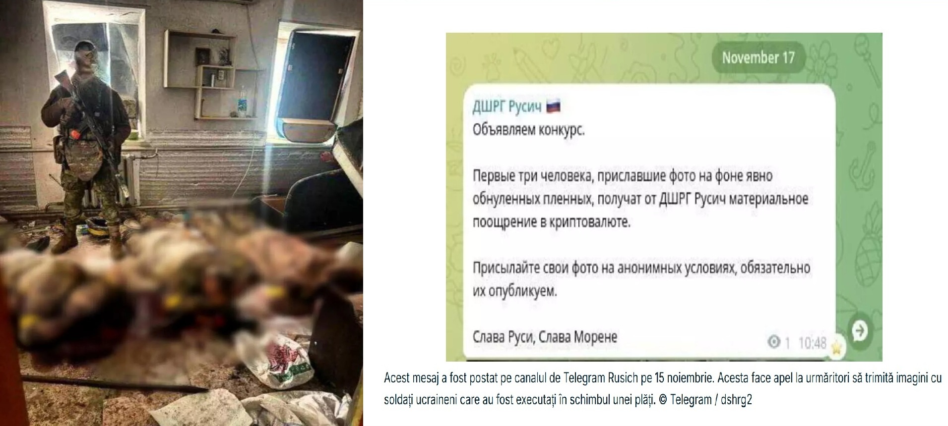 Gruparea paramilitară neonazistă rusă „Rusici” a postat pe Telegram, la mijlocul lunii noiembrie, o fotografie cu unul dintre luptătorii săi pozând lângă cadavrele a trei soldați ucraineni. Comentariul care însoţeşte imaginea spune că aceasta este „un exemplu despre cum face fotografii o armată de învingători, nu de victime”. Potrivit bloggerului pro-ucrainean Butusov Plus, fotografia a fost făcută în regiunea Pokrovsk, deși este imposibilă determinarea independentă a locului în care a fost realizată. Câteva ore mai târziu, fotografia a fost urmată de o a doua postare, în care urmăritorii contului erau îndemnaţi să trimită imagini asemănătoare cu promisiunea acordării de către grupul „Rusici” a unui premiu neprecizat în criptomonede. Anunţul concursului macabru a fost ulterior şters de către administratorii canalului Telegram, binecunoscut pentru că, încă de la crearea sa, distribuie conţinut care promovează crimele de război, inclusiv decapitări, execuţii şi acte de umilire a prizonierilor.