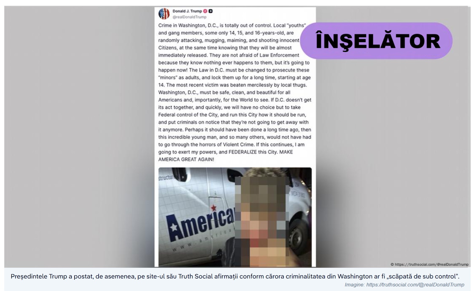 Afirmaţiile preşedintelui Trump sunt contrazise chiar şi de noul robot cu Inteligenţă Artificială disponibil pe reţeaua de socializare Truth Social, agreată de preşedinte. Întrebat dacă „criminalitatea este scăpată de sub control în Washington, DC?”, Truth Search AI a răspuns: „DC a avut un vârf sever al criminalităţii în 2023, dar datele din 2025 arată scăderi semnificative până în prezent […] Descrierea criminalităţii ca fiind «scăpată de sub control» exagerează tendinţa descendentă actuală.”