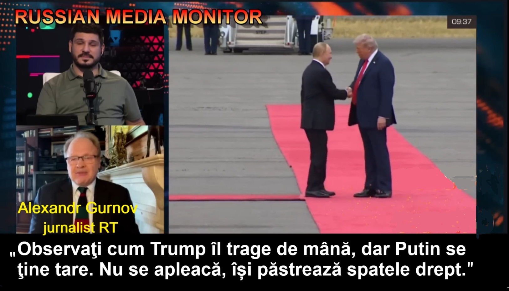 În timp cea o mare parte a presei occidentale consideră că întâlnirea din 15 august a preşedinţilor Vladimir Putin şi Donald Trump nu pare să fi apropiat perspectiva încetării războiului ruso-ucrainean, propagandiştii Moscovei jubilează, lăudând prestaţia liderului de la Kremlin în faţa omologului american. Într-o intervenţie în emisiunea radiofonică „În detaliu”, difuzată pe canalul „Soloviov Live”, jurnalistul Alexandr Gurnov de la Russia Today a enumerat ceea ce consideră a fi şirul de „victorii” obţinute de Putin în faţa gazdei sale de la Anchorage, incapabilă să-şi atingă scopurile propuse. Potrivit lui Gurnov, o primă izbândă ar fi fost limbajul corporal al preşedintelui rus, care a contracarat cu succes încercările previzibile ale lui Trump de a-l domina.