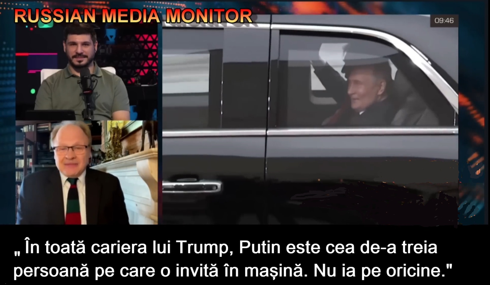 Au mers cam 20 de minute până la locul în care se ţineau discuţiile oficiale. Cred că au avut timp suficient să stea de vorbă. Putin stăpâneşte engleza şi au avut destul timp să dialogheze. Nu aveau traducător, nu mai era nimeni cu ei. Doar şoferul, iar dacă şoferul deschide gura, e terminat, după cum ştiţi. E greu să scoţi ceva de la un interpret, cu atât mai puţin de la un şofer. Dar ştiţi ce e interesant? Am citit astăzi că în întreaga carieră a lui Trump, Putin este cea de-a treia persoană pe care o invită în maşina lui oficială. Înaintea lui au fost doar preşedintele Franţei şi premierul Japoniei. Nu ia pe oricine în maşină. A fost o întreagă coloană oficială, dar ei au mers împreună. Aveau chestiuni de discutat. Am auzit chiar o glumă bună în timp ce porneau, cred că a spus-o un jurnalist occidental: «Aici vor hotărî împărţirea Ucrainei». Aşa că au împărţit-o. [Putin] i-a sugerat lui Trump să împartă responsabilitatea pentru continuarea conflictului între Kiev şi protectorii săi europeni. A fost Trump împotrivă? Nu. Nu a obiectat la niciuna dintre declaraţiile lui Putin, spunând în schimb «Vă mulţumesc pentru cuvintele frumoase» şi aşa mai departe. Este un lucru important. […]