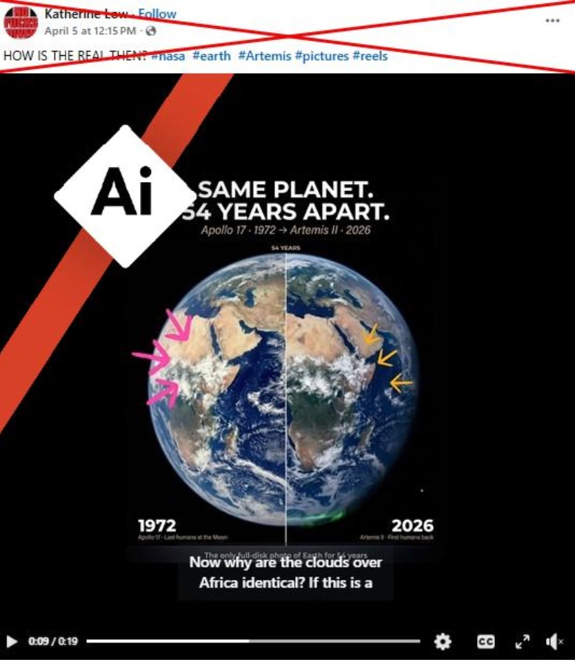 Imaginile juxtapuse pe reţelele de socializare nu au legătură cu nici fotografia din 1972, nici cu fotografia realizată de comandantul recentei misiuni Artemis. Mai mult, jurnaliştii nu au putut găsi nicio potrivire vizuală între imaginile postate şi cele din galeria oficială a NASA. În schimb, instrumentul de detectare Synt ID de la Google a identificat un filigran invizibil despre care compania spune că este ataşat conţinutului generat de Inteligenţa Artificială creat cu programele sale. Hive moderation, un alt instrument conceput pentru a detecta imagini bazate pe inteligență artificială, a evaluat că „este probabil să conțină conținut generat de inteligență artificială sau deepfake”, în special de la instrumentul Gemini AI de la Google.