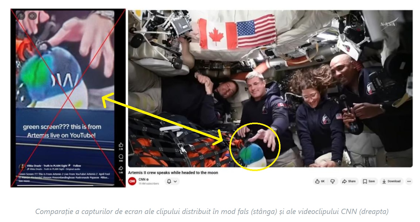 Misiunea spaţială Artemis II s-a încheiat, însă falsurile continuă să circule pe reţelele de socializare. De la afirmații neîntemeiate conform cărora survolul istoric al Lunii a fost înscenat cu tehnică cinematografică, până la relatări nefondate potrivit cărora imaginile cu echipajul au fost generate de Inteligența Artificială, Artemis II a generat întreaga gamă de dezinformări şi teorii ale conspiraţiei. Printre minciuni se număra și o imagine, vizionată de peste un milion de ori în reţeaua X, care îi înfăţişează pe membrii echipajului plutind în fața unui ecran verde și zâmbind spre camerele de filmat, sugerându-se astfel că misiunea spaţială a fost de fapt pusă în scenă într-un studio. În realitate, imaginea poartă semne evidente ale intervenţiei cu instrumentele inteligenței artificiale.